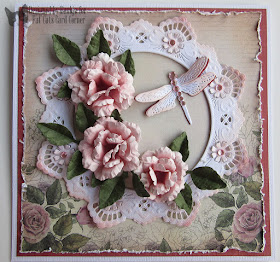Here I've again used the Marianne Design Creatables Petra's Circle w/Bird LR0457, the Marianne Creatables Frogs and Dragonfly LR0461, and the beautiful papers from the 6"x6" Rambling Rose Paper Pad by Ultimate Crafts. I love the little red eyed green tree frogs so coloured my frogs to look like them.
